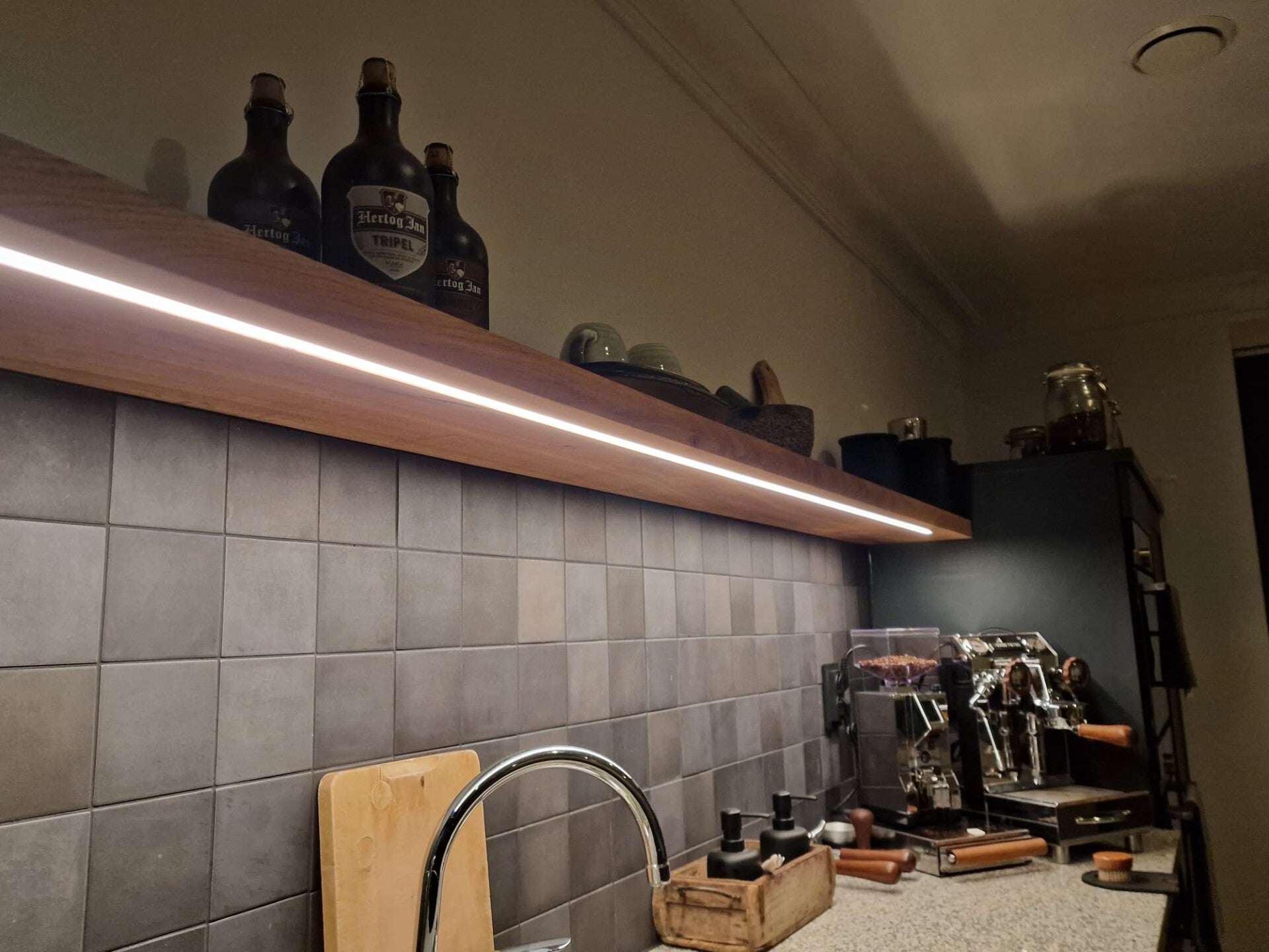 De wandplank wordt voorzien van dimbare ledstrip, led strip stop bij planken tot 150cm lang 10cm voor de uiteinden, planken langer dan 150cm is dit 20cm.